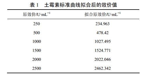 (1)土霉素標準溶液配制稱取土霉素對照品26.2mg放到小燒杯中,加入0.1mol/L的鹽酸溶液4.0mL,使之全溶,轉移至50mL容量瓶中,加0.01mol/L的鹽酸溶液定容,使之成為效價500.0U/mL的標準溶液。