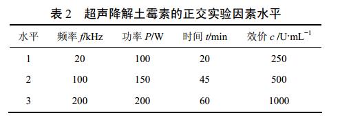 選取超聲頻率、功率、超聲作用時間和土霉素效價4個因素進行正交實驗,每個因素選定3個因素水平,正交因素及其水平見表2,正交實驗方案和結果見表3。