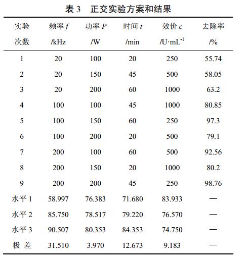 由各水平均值可知,超聲作用頻率越高,土霉素去除率越大,低頻20kHz超聲對土霉素去除率明顯低于高頻100kHz和200kHz;超聲功率的影響在本實驗中不是很大,在所選取的功率水平范圍內,土霉素的去除率相差不大;超聲作用時間越長,土霉素去除率越大,45min與60min之間的去除率變化較20min與45min之間小;初始效價值越小,去除率越高,由效價曲線可得出土霉素去除率隨效價增大而有所減小。