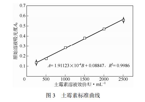 由圖3可知土霉素溶液的吸光度值與效價成一次線性關系,而非正比關系,故需根據圖3線性關系及超聲作用前后測出的吸光度值換算出溶液中殘留土霉素效價,再由公式: