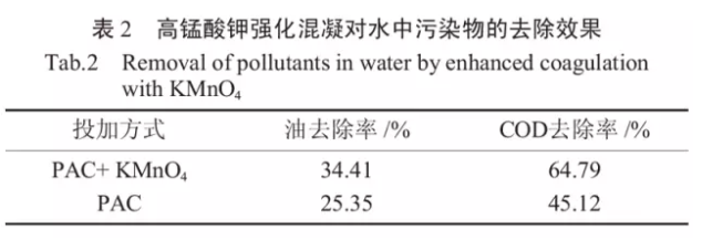 從表2可知,在相同的混凝反應條件下,經高錳酸鉀強化后油和COD的去除效果顯著,分別約提高了9.06%、19.67%,這說明高錳酸鉀強化混凝是可行的。分析其原因,主要是因為在pH為中性條件下,高錳酸鉀在直接氧化有機物的同時,其還原產物新生態水合二氧化錳具有較長的分子鏈和巨大的比表面積,能夠對含油廢水中帶負電的膠體顆粒產生很強的吸附作用,從而能夠促使廢水中的膠體顆粒相互結合成更大的絮體,進而達到提高對廢水中污染物的去除效果。