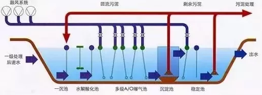 厭氧、缺氧、好氧三種不同的環(huán)境條件和不同種類微生物菌群的有機(jī)配合,能同時具有去除有機(jī)物、脫氮除磷的功能。
