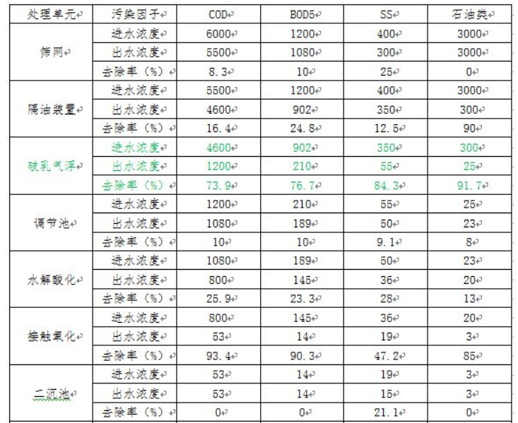 各環節主要污染物去除效率表(注:數據來自運行2個月的平均值)