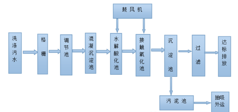 洗滌劑廢水的主要特點表現在廢水中的主要污染物是陰離子表面活性劑LAS,廢水中高濃度的LAS對微生物細胞的活性和增殖具有一定的阻礙作用。因此,使此類廢水的生物降解難度加大。廢水呈堿性,pH值通常在9—12.另外,廢水中缺少微生物合成細胞質必不可少的氮元素。根據次類廢水的特點確定采用由物化和生化處理相結合的工藝流程。物化處理采用混凝沉淀,生化處理采用水解酸化和接觸氧化。