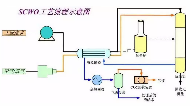 超臨界水氧化(Supercritical Water Oxidation,簡稱:SCWO)是以超臨界水為介質,均相氧化分解有機物。可以在短時間內將有機污染物分解為CO2、H2O等無機小分子,而硫、磷和氮原子分別轉化成硫酸鹽、磷酸鹽、硝酸根和亞硝酸根離子或氮氣。美國把SCWO法列為能源與環境領域最有前途的廢物處理技術。