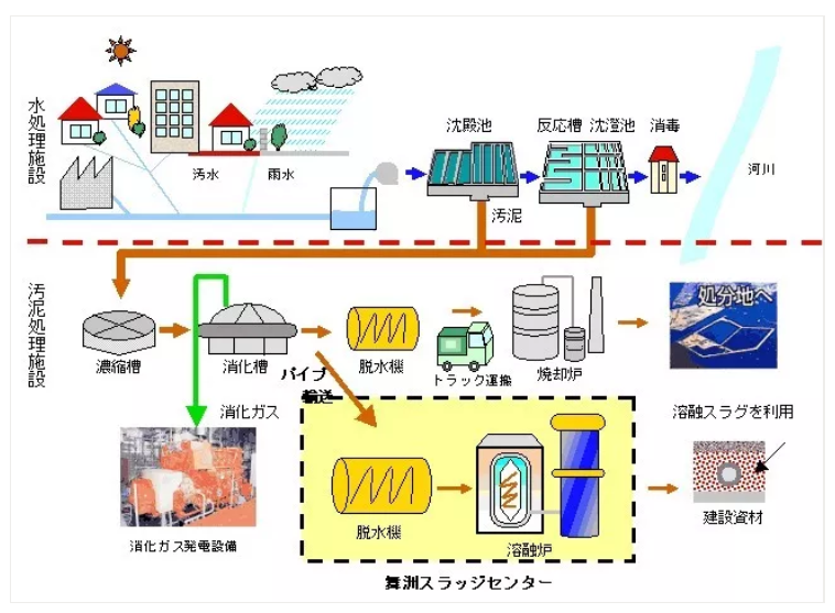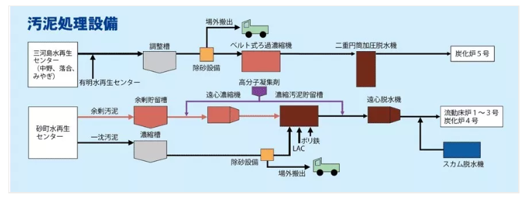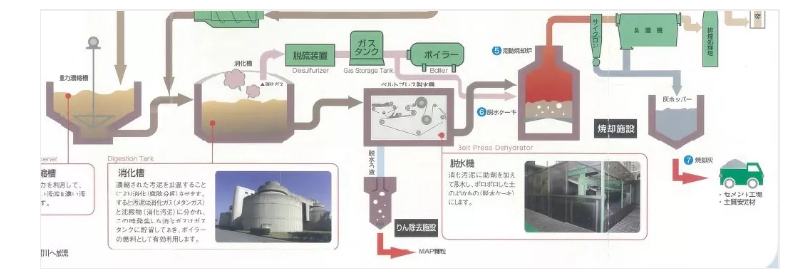 東京東部污泥廠處理污泥處理工藝:濃縮→脫水→焚燒或碳化,工廠內(nèi)設(shè)置蒸汽發(fā)電設(shè)施,可以利用污泥焚燒爐的余熱加熱蒸汽發(fā)電進(jìn)行區(qū)域供熱和制冷。
