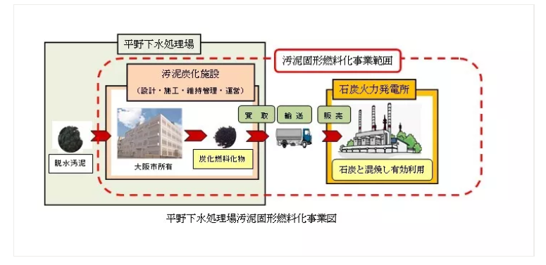 平野污水處理廠的污泥處理工藝為濃縮→消化→脫水→熔化或碳化。污泥固體燃料化設(shè)施采用200~350℃的低溫碳化技術(shù),制成的固體燃料具有發(fā)熱量高、低臭氣的特點。每天可處理脫水污泥150 t,制成的燃料送往火力發(fā)電站,與煤炭混合燃燒用于發(fā)電。