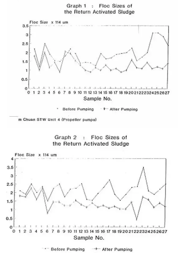 從上圖來看,采用螺旋離心泵輸送前后的活性污泥菌膠團尺寸變化不大,維持原有污泥活性。而其他形式離心泵輸送前后尺寸變化較大,回流后的污泥效果變差,需要增大回流比來維持處理效果。