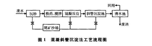 來自車間的廢水,首先通過沉砂池進行固液分離,沉砂池沉砂通過卸砂門排入尾礦砂場。沉砂池溢流出的上清液,通過投藥混合后進入反應器充分混凝反應,然后流入斜管沉淀器,使細粒懸浮物、有害物進一步去除,斜管沉淀器的沉泥,通過閥門排至尾礦砂場。通過此工藝后,廢水即達國家允許排放標準。根據環保的要求,斜管沉淀器出水進入清水池,用清水泵打回車間回用,節約用水,并使廢水閉路循環,實現零排放。其工藝流程如圖1。