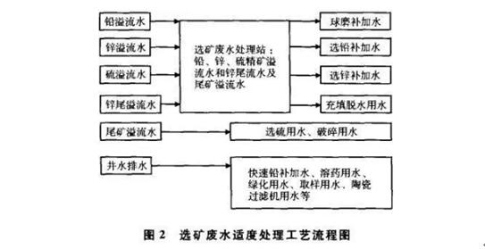 專業人士經過大量的水處理試驗和選礦對比試驗綜合研究,總結出一條解決礦山選礦污水的較好方案。以鉛鋅礦為例,其工藝流程如圖2所示。