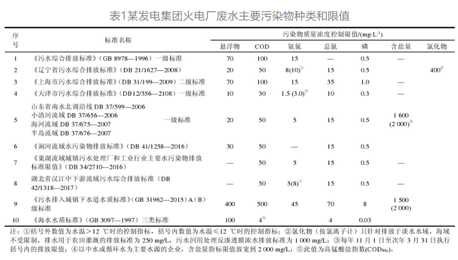 表1某發電集團火電廠廢水主要污染物種類和限值