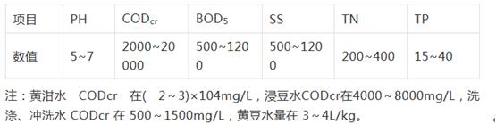 在豆腐生產過程中,廢水主要來自水洗、浸泡和壓濾工序,以及部分沖洗水,其中水質及水量如表所示。