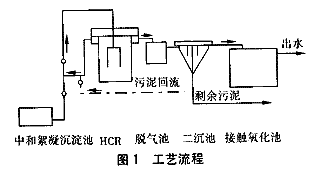 首先用石灰乳將廢水pH值中和至6.5~8,然后加入PAFC(聚合氯化鋁鐵),絮凝沉淀0.5h(COD去除率為20%~30%)后上清液進入HCR。HCR出水經脫氣池(主要脫去附著在活性污泥表面的CO2、空氣等)脫氣后進入沉淀池進行泥水分離,HCR可去除70%~80%的COD。沉淀池出水經接觸氧化池處理后出水達到進入城市管網的排放要求。