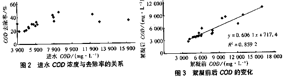 試驗把PAFC作為絮凝劑,進水COD濃度對其去除率的影響及絮凝前后COD的變化分別 見圖2、3。由圖2知,絮凝對COD的去除率相對穩定,其值穩定在25%~35%。絮凝前后的COD濃度相關直線斜率為0.6,相關系數>0.9(圖3)。