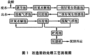 捷德紡織廠采取邊改造邊生產的方式進行。由于二級生物濾池對有機物的降解率只有30%~4 0%,且滋生蚊蠅,決定利用現有的厭氧水解池,打掉二級生物濾池,改成生物接觸氧化池。 但厭氧水解池對COD的去除率僅有10%~20%,大量負荷會帶給后續處理構筑物,為減少生化改造期間的污染,在厭氧水解池前加一套物化處理設備(即化學混凝沉淀),以降低負荷。