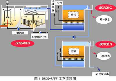 由英國Degremont有限公司推出了一種用于城市污水再生處理的新組合工藝專利技術——高負荷澄清池和生物曝氣濾池(BAFF工藝),法國OTV等公司也有相似技術如BIOSTYR推出,本文重點介紹建設于英國Poole STW地區的BAFF工藝,及其該工藝的設計、調試、運行狀況。 1 BAFF工藝介紹 BAFF工藝是目前比較先進的一種污水處理新技術,能夠使污水出水水質滿足日益提高的排污標準,包括對氨氮的嚴格控制。該工藝利用高效的復合澄清技術(DENSADEG)和生物曝氣濾池(BAF)工藝相結合,實現高標準的污水處理目標,工藝如圖1所示。 1.1 高負荷澄清池(DENSADEG)