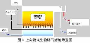 高負荷澄清池不僅能夠實現相當程度的污泥濃縮,還能實現非常高的水力負荷,所以該工藝十分的緊湊。 高負荷澄清池由三部分組成,分別是反應池、預沉濃縮池和斜板分離器,如圖2所示。 向經過格柵和除砂后的污水中加入Fe2(SO4)3,經快速混合后,污水在反應器內進行混凝。同時,回流污泥也回流到反應池,然后污水溢流進第二反應室。 第二反應室配備帶有旋轉垂直柵條的濃縮機械裝置。懸浮物沉到池底,并由旋轉刮泥機進行濃縮。澄清后的 液流流經斜板并收集于集水槽中,最終匯集到中心渠道。 污泥分離是由裝有液面探測器的自動化分離泵控制,這樣可以維持低高液面間的懸浮泥渣層,從而控制泥齡和干固體濃度。 1.2 生物曝氣濾池 (BAFF)