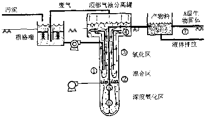 加拿大諾曼公司在污水處理方面推出了一項專利技術--雙威污水污泥處理系統,包括VERTREATTM污水處理工藝(簡稱VT工藝)和VERTADTM污泥處理工藝(簡稱VD工藝)。在加拿大和美國已建有3座采用該工藝的污水處理廠投入運行。 1 VT處理工藝 1.1 工藝概況 VT污水處理工藝利用潛置于地下的豎向反應器對污水進行超深水好氧生物處理。該工藝與普通深井曝氣工藝相比,其主要特點是:設有3個不同功能的處理區,使反應池體積更小、氧的利用率更高,從而有效地降低了工程投資和運行費用。井式生化反應器從上而下分為氧化區、混合區及深度氧化區3個部分(見圖1)。該反應器深一般為75~110 m,直徑通常為0.7~6 m。 VERTREATTM是一種高效率的生物反應器,可以廣泛地用于高濃度工業廢水和生活污水的處理,與其他深井曝氣工藝相比較,其不同之處在于,VERTREATTM工藝包括3個不同的處理區。氧化區:這個區在井筒的上部,包括一個同心通風試管和供混合液體再循環帶;混合區:這個區域直接位于氧化區的下部,恰好位于整個井深度為3/4的位置,上部區域高速率的生物氧化反應所需的空氣注入到混合區,提供空氣提升循環的運行動力;深度氧化區:這部分位于井的底部。 VERTREATTM反應器可以通過普通的井鉆和井鑿技術來安裝。反應器深度通常可達110 m,其占地面積僅相當于傳統活性污泥法一個反應池的占地;其空氣消耗量為傳統活性污泥法的10%。井筒的直徑一般可達3 m,其具體大小由待處理的污水的水質和水量來決定。 1.2 工藝流程 參見圖1,工藝具體流程如下: ①起始階段,空氣通過入流管進入混合區以產生循環。升起的氣泡產生一個密度坡度,從而導致空氣在氧化區內循環。