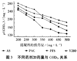 分析混凝實驗結果圖1和圖2可知,在Y280的加藥量為400mg/L時色度能達標,CODcr達標的Y280加藥量為520mg/L,達標時Y280對這種廢水的CODcr去除率為40%,色度去除率為75%。在Y280的投加量為1000mg/L時可出現最好的水處理效果,此時CODcr去除率達80%以上;色度去除率可達90%以上。 2.2 Y280與常用混凝劑的用量比較 硫酸鋁(AS),聚合氯化鋁(PAC),聚合硫酸鐵(PFS)是常用的混凝劑,為了進一步了解Y280的水處理性能,將其與AS,PAC,PFS進行對比。所有對比實驗在相同的條件下進行,用CODcr達標時各藥劑投加量作為對比依據。實驗結果見圖3。從圖3分析可知,AS的達標投加量為450mg/L,PAC的達標投加量為430mg/L,PFS的達標投加量為330mg/L。結合Y280的實驗結果可看出,在CODcr達標時,Y280的用量分別是AS,PAC,PFS用量的1.15倍,1.21倍和1.58倍。 2.3 Y280的水處理成本評價