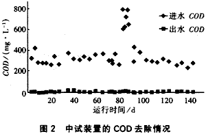 運行期間進水COD的平均值為366.4 mg/L,最大值為780.9 mg/L,最小值為228.0 mg/L。出水COD的平均值為13.1mg/L,最大值為25.2mg/L,最小值為4.4mg/L,COD的平均去除率為96.0%;沖擊負荷對出水COD去除沒有影響,這說明系統的穩定性和可靠性。試驗結果如圖2所示。