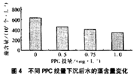圖4表明PPC預氧化具有較好的除藻效能,且隨著PPC藥劑投量的增加、沉后水藻含量逐漸下降,當PPC投量增加到1.0mg/L時,沉后水藻含量降為335×104個/L,比常規混凝處理下降了46.4%。