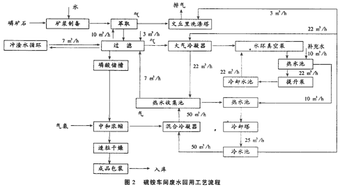 工藝要點為:萃取尾氣洗滌水用作過濾工序盤式過濾機二次沖洗水;兩臺水環真空泵冷卻水經冷卻后循環使用;設立循環水站,將大氣冷凝器和混合冷凝器冷凝水冷卻后循環使用;以熱風機及料漿循環泵冷卻水作為補充水。原磷鉸車間40m3/h的冷卻水全部回用。