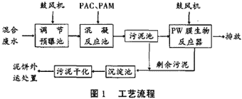 混合廢水通過格柵,大顆粒可沉固體及漂浮物被攔截,進(jìn)入調(diào)節(jié)池,經(jīng)調(diào)節(jié)水量、水質(zhì)和預(yù)曝氣后用泵輸送至混凝反應(yīng)池,分別加入適量的PAC、PAM溶液進(jìn)行混凝和絮凝反應(yīng),反應(yīng)液自流入沉淀池進(jìn)行固液分離。經(jīng)過上述預(yù)處理的廢水上清液溢流進(jìn)入PW-W膜生物反應(yīng)器,在充氧曝氣和微生物的作用下將有機(jī)物降解為二氧化碳和水,并由膜組件進(jìn)行固液分離,處理后廢水達(dá)標(biāo)排放。