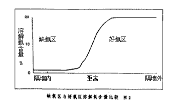 OCO工藝的一個主要特點是:好氧區與缺氧區之間的污水交換,即內回流不需泵送,以上兩個區域之間有一段是相通的。兩者之間的交換形式及量的大小是依靠攪拌器的控制來實施,因此節省能耗。當攪拌器運轉時,湍流增強,好氧區與缺氧區混合程度增強,當攪拌器停止運轉時,兩區之間的混合程度較低。此時測得的溶氧狀況如圖2所示,好氧區與缺氧區的區分很明顯。OCO反應池的構造和攪拌器的循環工作可保證好氧區和缺氧區之間很高的回流比,這種頻繁的變化是該工藝有效脫氮的關鍵之一。