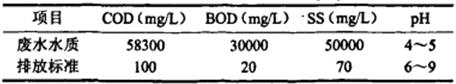 鄭州市某酒精廠以玉米為原料生產酒精,年產酒精1萬噸,酒精生產采用濕法生產代替傳統的全粒法,即將玉米浸泡分離了胚芽后,用淀粉漿生產酒精。分離胚芽后生產酒精,一方面減少了廢水中脂肪、蛋白質的含量,降低了水污染程度和廢水處理難度,另一方面分離出的胚芽可生產玉米油,創造可觀的經濟效益。該酒精廠每天產生酒精廢水400m3,廢水主要來源于浸泡廢水、發酵蒸餾后的酒精糟液及車間設備沖洗水,廢水的水質狀況及排放標準見表1。