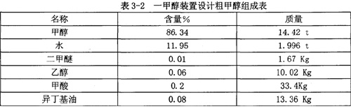 粗甲醇為甲醇精餾工序的原料,以天然氣為原料的粗甲醇產品中其主要成分如下(以10萬噸甲醇裝置為例,合成條件為5Mpa以下,290℃以下,銅鋅催化劑):