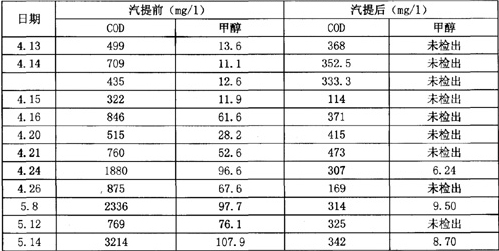 4.實際運行效果:本甲醇廢水預處理流程自06年4月下旬投用運行至今,處理情況良好,尤其是在06年5月份廢水處理站處于檢修時,該處理流程發(fā)揮了更大的功能,經(jīng)汽提塔處理后的廢水基本達到外排水標準,具體情況見下表。