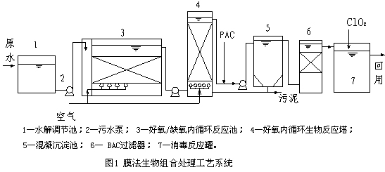 由于甲醇廢水水質(zhì)和水量波動大,不利于生物處理,因此生化處理前必須設(shè)水解調(diào)節(jié)池,確保生物后續(xù)處理作用穩(wěn)定。由于排放的廢水對一般好氧菌有明顯的抑制性,COD去除效果差。因此,在曝氣生化塔前設(shè)倒置的膜微孔曝氣生物接觸氧化A/O 反應(yīng)池,確保有機(jī)物在生物組合反應(yīng)器內(nèi)得到較充分降解,去除大部分COD,同時提高廢水的可生物降解性,為后續(xù)好氧生物處理創(chuàng)造有利條件。廢水經(jīng)倒置的膜微孔曝氣生物接觸氧化A/O工藝處理后,COD去除率高,可生化性提高,對后續(xù)好氧生物也無抑制作用,因此有利于進(jìn)行后續(xù)好氧生物處理。在膜微孔曝氣生化塔內(nèi)充分曝氣供氧的條件下,廢水中剩余的有機(jī)物在好氧菌作用下充分利用水中溶解氧得到充分降解和去除,廢水COD達(dá)回用要求。好氧生化塔處理后出水仍含有一定量的懸浮物、細(xì)菌和雜質(zhì),需再經(jīng)過后續(xù)物化混凝和和活性炭過濾處理,通過生物絮凝和物化混凝協(xié)同作用,將水中的懸浮物雜質(zhì)細(xì)菌和部分難降解有機(jī)物有效除去,使出水COD等指標(biāo)達(dá)回用水質(zhì)要求。