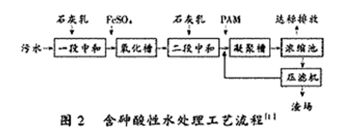 兩段中和加鐵鹽去除含砷污水處理工藝,處理效果的優(yōu)劣與工藝裝備及測控設施的先進可靠程度有關,關鍵設備及儀表采用目前國內(nèi)外的先進產(chǎn)品,能為整個處理工藝的達標運行奠定了可靠的基礎。