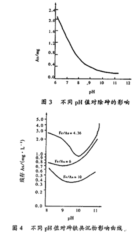 二段中和控制PH=10~11,使上述反應中的鐵砷鹽和鈣鹽在堿性條件下完全沉淀。在上述反應中,要保證砷的去除率達到99%,關鍵在控制二段中和反應的條件,依據(jù)有關去砷的試驗資料,見圖3、圖4,但二段中和反應控制PH=9~11時,可使出水中As<0.5mg/L。