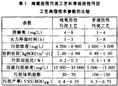 在活性污泥工藝中應用純氧曝氣,不應簡單地被看作只是替代常規的空氣曝氣裝置,更重要的是由于純氧的應用可導致活性污泥工藝中許多重要技術參數發生顯著的改變,從而形成一種活性污泥工藝的變型,即純氧活性枵泥工藝。表1中列示了同一污永的常規活性污泥工藝和純氧活性污泥工藝的相關技術參數比較。