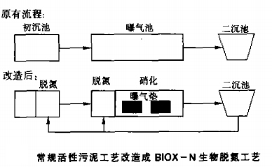 3、應用于污水生物脫氮的三級處理廠,即采用BIOX-N工藝。由于純氧曝氣可顯著提高污泥濃度和曝氣池容積負荷,不僅可縮小曝氣池容積,而且由于污泥負荷的降低,有利于硝化反應的發生。所以在污水處理廠的脫氮改造時,可將原有曝氣池的一部分隔開,用作反硝化的缺氧池,剩余部分則為純氧曝氣的硝化池(見圖)。這樣,無需新建任何構筑物就可以實現污水處理的脫氮升級。