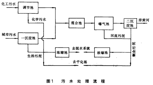 1989年中國石化蘭州化學工業公司化肥廠建成處理能力2400 m3/d的廢水處理裝置,用來處理甲醇和甲醛車間、烏洛托品和硫酸二甲酯車間排放的廢水,其制氧以外各項目總投資175萬元(該廠有空分制氮裝置,氧氣作為副產品用于污水處理)。該廢水成分復雜,污染物濃度高,水質波動大,COD濃度有時高達20 000mg/L(平均值為150018mg/L),而且廢水中含有較高濃度的對微生物有害的物質甲醛(200~900mg/L)等,用傳統的活性污泥法不能處理,因此采用了純氧曝氣活性污泥工藝。處理系統有2套純氧曝氣裝置,每套包括進水泵、充氧器、生化反應池, 共用調節池、混合池及二沉池,氧氣由廠內原有的空分制氧供給。裝置投運后,甲醇去除率為100%,甲醛去除率>97%,BOD去除率>92%,在車間事故排放高濃度廢水的沖擊下也能很快恢復正常運行,廢水處理直接成本為0.46元/m3,充分顯示了純氧曝氣活性污泥工藝在技術經濟上的優越性。