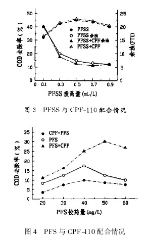 此外,從圖4可知,若先加有機(jī)高分子絮凝劑(CPF-110),后加PFS,絮凝效果要差得多,甚至不如單一的PFS。這進(jìn)一步證實要在膠體脫穩(wěn)的基礎(chǔ)上,網(wǎng)捕和架橋功能才能發(fā)揮協(xié)同作用。