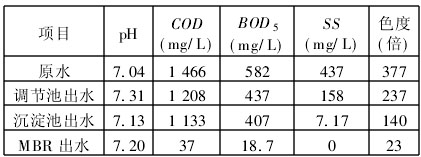 生產廢水和生活污水匯流后先經粗格柵去除大的懸浮物和廢紙屑等雜物,再經細格柵去除細小的懸浮物和藥材后流入厭氧調節池(調節水質、水量并去除大部分COD和色度),厭氧調節池的出水經斜沉淀池去除絕大部分懸浮物后被入MBR反應器,廢水中的有機物和色度被微生物分解,并通過超濾膜實現了泥水分離。MBR池的剩余污泥回流至厭氧調節池,厭氧調節池和斜沉淀池的剩余污泥用污泥打入污泥池(定期外運)。為防止膜污染,在膜生物反應器啟動時采用了膜通量分階段由小到大的運行方式;系統正常運行后采用低壓、恒流、間歇吸水、空曝氣的操作方式來減緩膜污染。