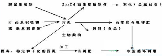 本課題組將重金屬超累積植物用于處理Zn等重金屬較高的污泥,并和經過篩選的、低累積重金屬的玉米品種組合在一起,套種在城市污泥之上,富積在超累積植物體內的重金屬灰化后可回收金屬,同時低累積玉米品種可生產出合格的飼料或食品,在植物種植期間使污泥脫毒(去除重金屬)、干化和穩定化,從而同步實現重金屬污染污泥的無害化、減量化和資源化,實現城市污泥的農業綜合利用(圖1)。
