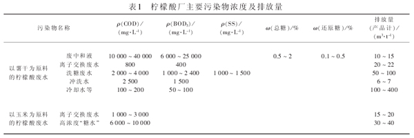 檸檬酸生產主要污染物濃度及排放量見表1(檸檬酸工業廢水處理現狀)