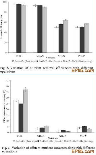 COD 和NH4-N的去除率在不同的操作中基本相同。但是,在五步操作過程中NO3-N 和 PO4-P明顯高于其他操作。雖然五步操作時間相對于其他操作較長,但是更有利,因為出水水質較低。
