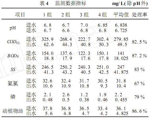 (2)經(jīng)濟(jì)效益。工程總投資 38 萬元。污水處理站日耗電量為102. 8 kW· h ,電費(fèi)以 0. 8 元/ kW· h 計(jì) ,則日耗電費(fèi)為82. 24元。處理費(fèi)用為0. 33元/ t水 (不計(jì)人工費(fèi)與折舊費(fèi)) 。污水處理站出水可回用作洗地板及淋花用水。