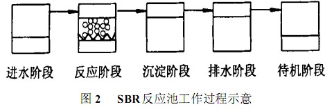 進(jìn)水工序是反應(yīng)池接納污水的過程。在污水流入開始圖2 SBR反應(yīng)池工作過程示意之前是前一個(gè)周期的排水或待機(jī)狀態(tài) ,因此反應(yīng)池內(nèi)剩有高濃度的活性污泥混合液。這相當(dāng)于傳統(tǒng)活性污泥法中污泥回流的作用 ,此時(shí)反應(yīng)池內(nèi)的水位最低。在進(jìn)水過程所確定時(shí)間內(nèi)或者說在到達(dá)最高水位之前 ,反應(yīng)池的排水系統(tǒng)一直是在關(guān)閉狀態(tài)。進(jìn)水工序進(jìn)行攪拌可達(dá)脫氮的目的。