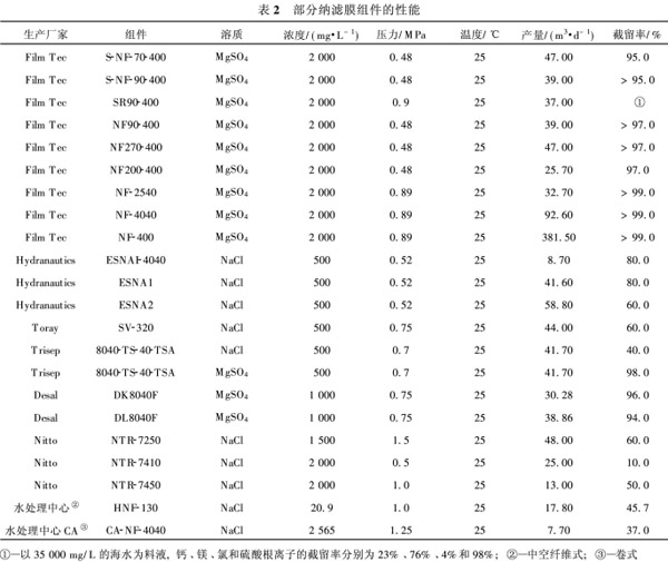 商業(yè)上的納濾膜組件大多為卷式組件,此外也有采用管式和中空纖維式的納濾膜組件。表2所示是部分納濾膜組件的性能。