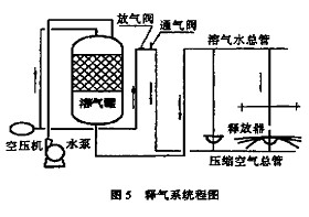 由于釋放器的至關(guān)重要及特殊性 , 根據(jù)本廠軋鋼廢水的特性 .特選用了上海 同濟(jì)大學(xué)研制生產(chǎn)的 ’ I V一2型釋放器 1 8個(gè) .分三排安裝于氣浮內(nèi)。 溶氣釋放系統(tǒng)瘋程見(jiàn)圖 5 。 氣浮池接觸區(qū)是待處理廢水和釋放器釋出微氣泡接觸的區(qū)域。T v一2型釋放器是在滲氣釋放基本原理的基礎(chǔ)上,結(jié)合振動(dòng)原理而研制成功的。其釋氣率達(dá) 9 9 %以上。釋放氣泡直徑 2 0—3 0 , u , m; 低壓有效運(yùn)行. 釋出水的分布均勻性好 ,增加了微氣泡與水 中油懸浮物碰撞粘附的幾率,從而進(jìn)一步改善了氣浮凈水效果。此外 .該釋放器具有抗堵塞功能, 一旦受堵,只要在氣浮池外打開(kāi)通氣閥接通壓縮空氣氣源 ,就能利用壓力溶氣水將釋放器內(nèi)的堵物沖洗干凈 .這過(guò)程一般只需2 0 s , 給操作人員帶來(lái)很大方便。