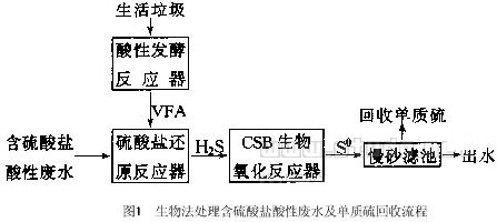 課題組通過三年的實驗室研究提出了以生活垃圾酸性發酵產物為硫酸鹽還原菌碳源的生物法處理含硫酸鹽酸性廢水及單質硫回收工藝路線。其工藝流程如圖1。以生活垃圾酸性發酵產物為硫酸鹽還原菌碳源生物法處理含硫酸鹽酸性廢水及單質硫回收的研究分為四個部分: (1)生活垃圾酸性發酵的產酸特性研究;(2)以生活垃圾酸性發酵產物為碳源,利用硫酸鹽還原菌處理含硫酸鹽酸性廢水的研究;(3)利用無色硫細菌生物氧化硫化物生成單質硫的研究;(4)無色硫細菌生物氧化硫化物出水中單質硫的回收。