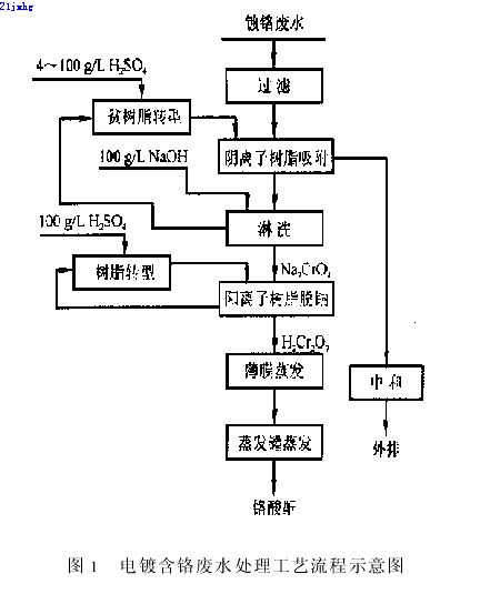 山東省平度市電鍍中心主要為機(jī)動腳踏車零配件鍍鉻,其廢水中ρ(Cr6+)達(dá)100~1000mg/L。每d產(chǎn)生的50m3含鉻廢水,用BaCO3沉淀處理后,外排廢水中ρ(Cr6+)仍可達(dá)約10mg/L,并產(chǎn)生大量的BaCrO4污泥堆放在廠區(qū),加上車間地面滲漏,使該電鍍中心方圓近1hm的范圍內(nèi)深水井水中ρ(Cr6+)達(dá)2~4mg/L,嚴(yán)重影響著該廠的生存,也制約了該廠的發(fā)展。為此,廠方委托核工業(yè)北京化工冶金研究院提供電鍍廢水治理方案。在大量調(diào)研和試驗的基礎(chǔ)上,提出了離子交換蒸濃法處理電鍍廢水工藝,設(shè)計并建成了處理能力為100m3/d的廢水處理設(shè)施,成為膠東地區(qū)首家實現(xiàn)CrO3閉路循環(huán)利用、外排廢水達(dá)標(biāo)、經(jīng)濟(jì)效益顯著的污水處理工程。