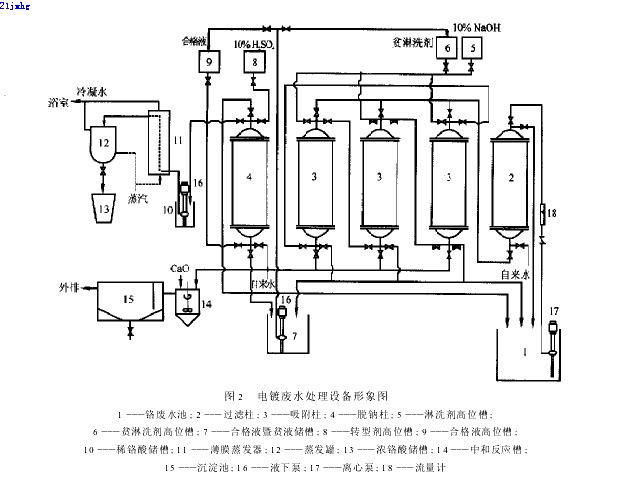 在離子交換樹脂的篩選、條件試驗和現(xiàn)場連續(xù)臺架試驗的基礎(chǔ)上,提出了離子交換蒸濃法處理電鍍廢水的治理方案。其主要工藝過程包括廢水均質(zhì)、過濾、陰離子樹脂吸附、負(fù)載樹脂淋洗、陰離子樹脂轉(zhuǎn)型、陽離子樹脂脫鈉、稀鉻酸蒸發(fā)濃縮、濃鉻酸除SO42-和吸附尾液中和排放。工藝流程示意圖如圖1,設(shè)備形象圖如圖2。