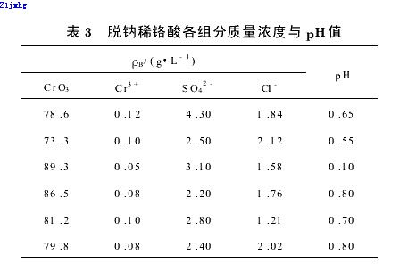 淋洗得到的合格液中的鉻為Na2CrO4,必須經(jīng)離子交換轉(zhuǎn)變?yōu)椋?Cr2O7才能被濃縮回收。脫鈉操作采用H+型的陽離子交換樹脂,合格液由高位槽通過流量計從柱的底部進(jìn)入,Na2CrO4中的Na+和樹脂上的H+發(fā)生交換,生成的H2Cr2O7從柱上部流出,把流出液pH<25或樹脂由橙紅色變?yōu)槌壬暈槊撯c終點;然后將柱內(nèi)的Na2CrO4放回合格液儲槽,用水洗柱,洗水流入鉻廢水池;最后用100g/LH2SO4將Na+型樹脂轉(zhuǎn)變?yōu)椋?型,轉(zhuǎn)型后的樹脂用水洗至接近中性,洗水作為陰樹脂的轉(zhuǎn)型劑或排入鉻廢水池調(diào)節(jié)廢水的pH值。脫鈉后的稀鉻酸化學(xué)組成列于表3。